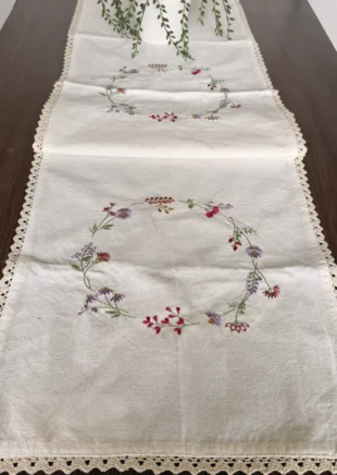 Vintage-Style Embroidered Wreath Runner with Crochet Edge 13″*60″