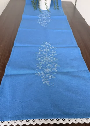 Blue & White Embroidered Linen Runner with Crochet Border 13″*60″