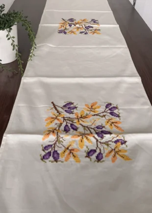 Harvest Berry Cross-Stitch Table Runner – Purple and Gold Autumn Vine Decor