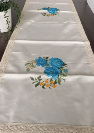 Cross-Stitched Blue Rose Wreath Table Runner – Cream Satin-Finish with Lace Trim