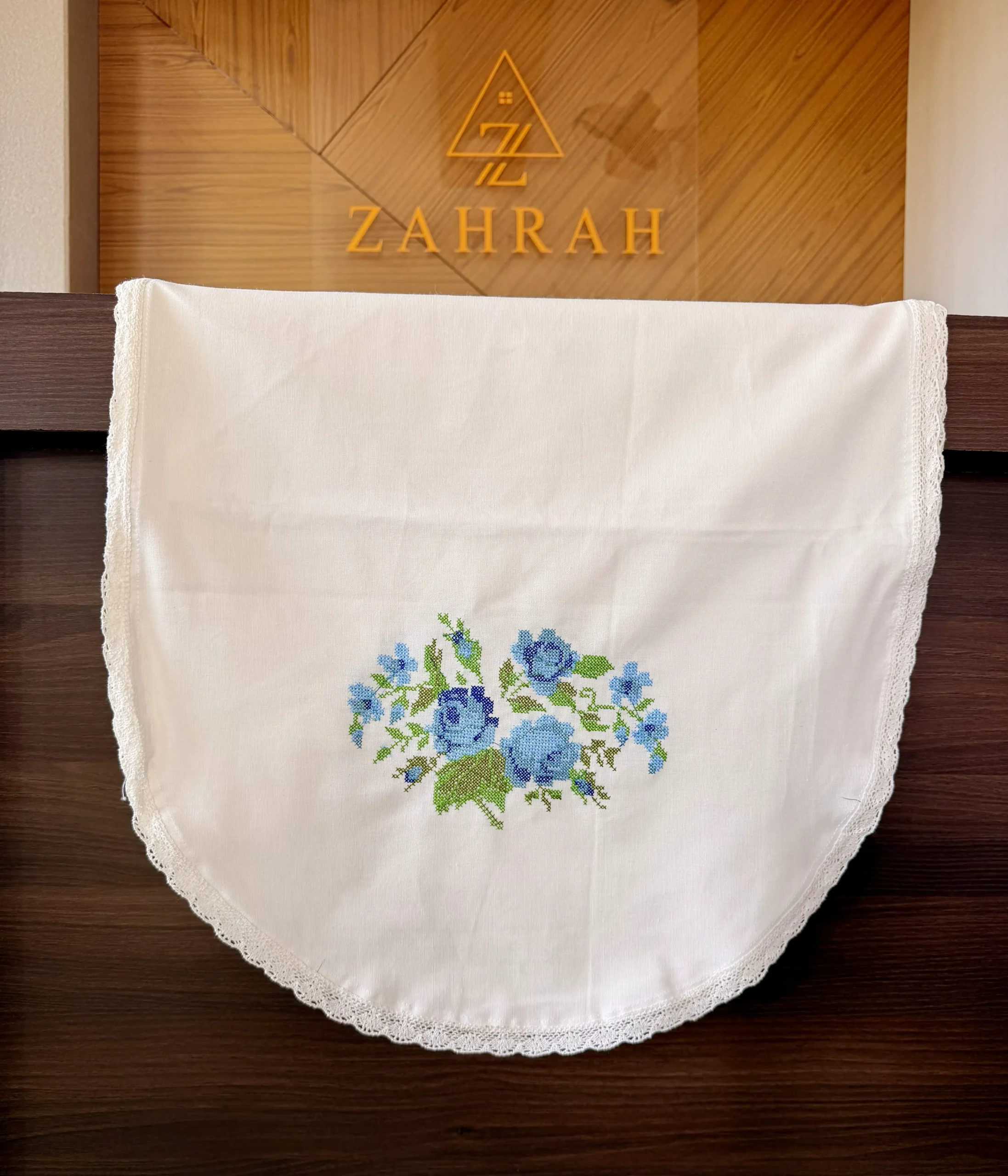 Pink Rose Cross-Stitch Chair Back Cover – Cream Fabric with Scalloped Lace Trim