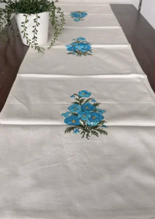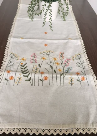 Hand-Stitched Forget-Me-Not Floral Table Runner – Cream Linen-Satin Mix