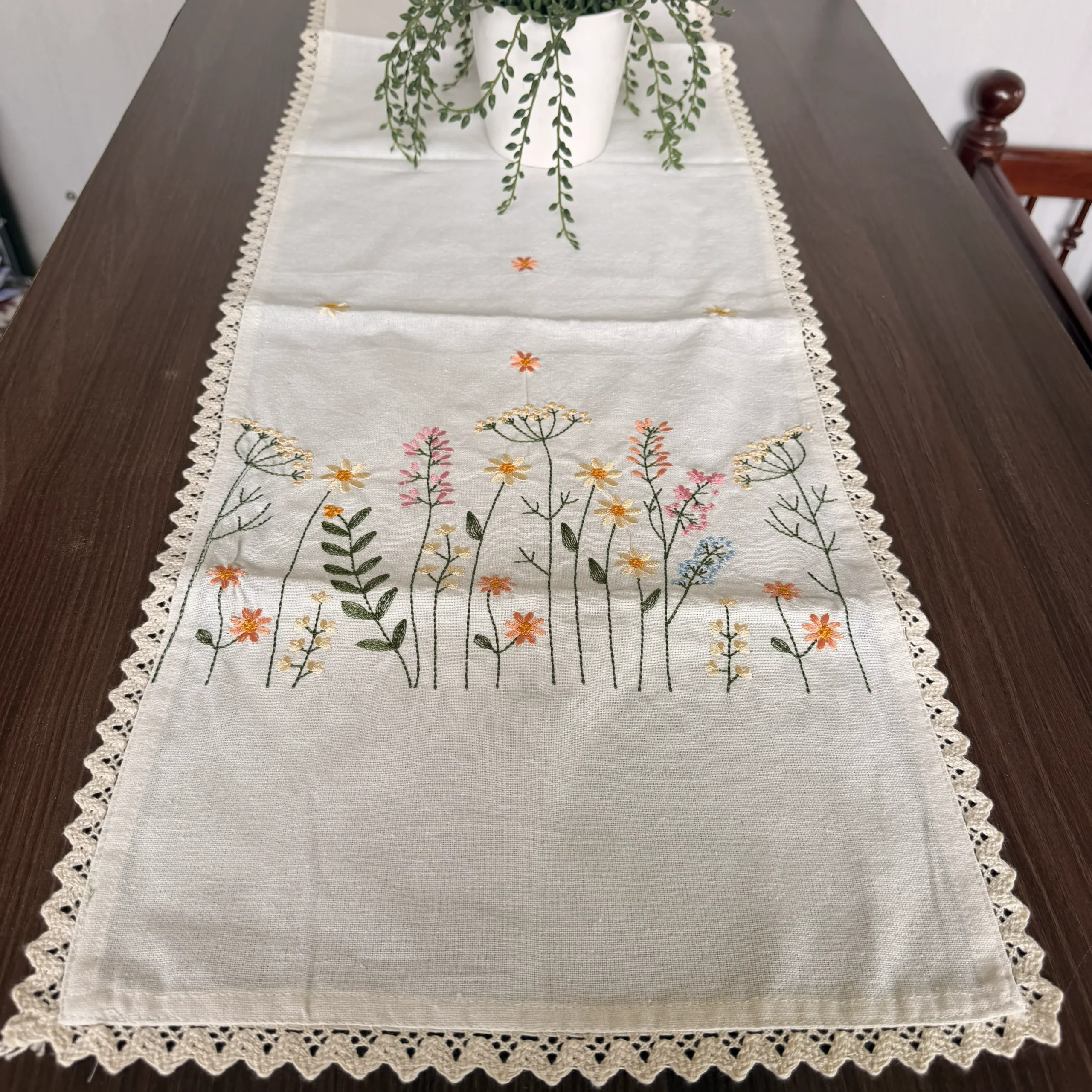 Hand-Stitched Forget-Me-Not Floral Table Runner – Cream Linen-Satin Mix
